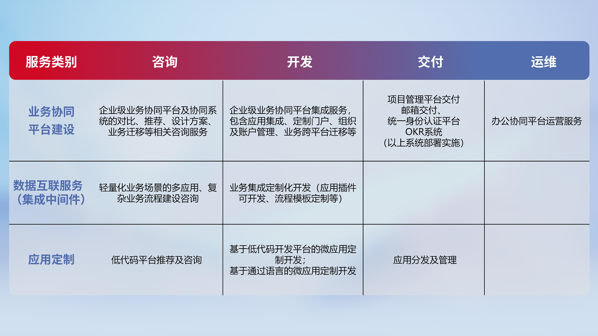 针对钉钉、、企微、、、IDaas等平台级产品提供产品的规划、、、、方案、、、交付、、定制化开发等服务,,实现如统一协同办公、、智能客户服务、、混合会议管理、、、、智能数据查询、、、等业务场景,,,实现数字化转型。。。